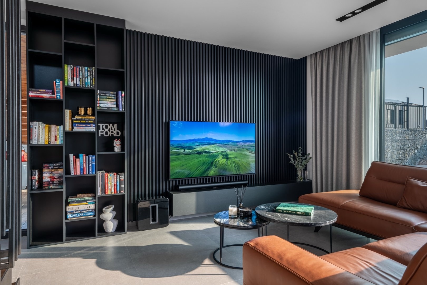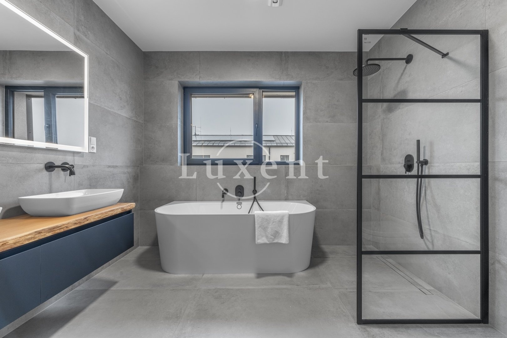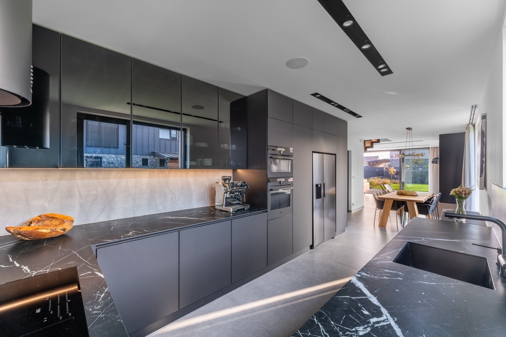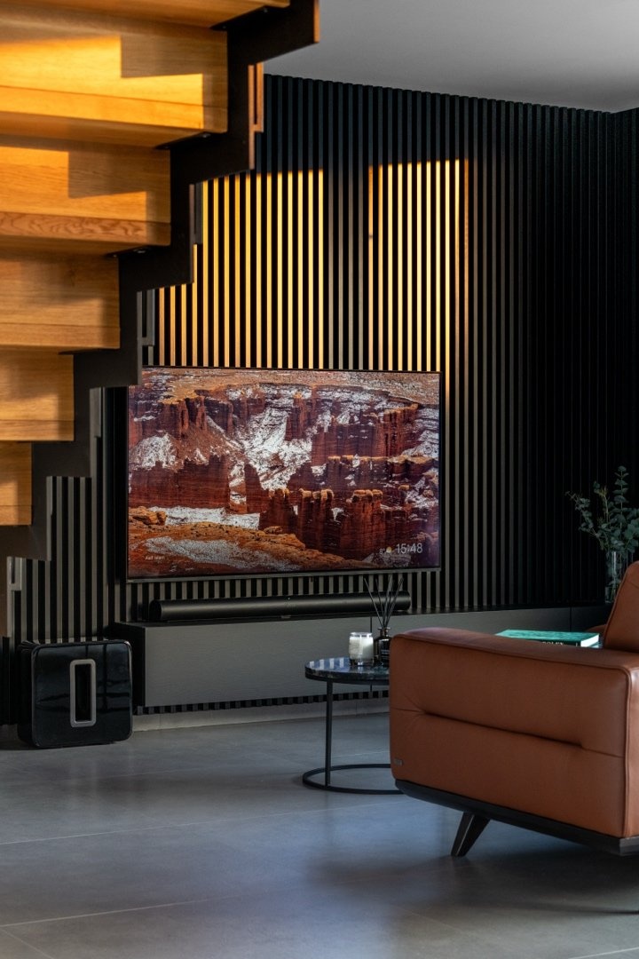 V 1.NP je prostorná předsíň s vestavěnými šatními skříněmi, pokoj pro hosty (12 m²), koupelna se sprchovým koutem a toaletou, technická místnost a elegantní minimalistická kuchyň s jídelním koutem (27 m²), na kterou navazuje prosvětlený obývací pokoj s krbem ( 38,5 m²). Z obývacího pokoje je přístup na terasu, která má na západní části instalovanou bioklimatickou pergolu s LED osvětlením. Celé 1.NP má italskou velkoformátovou dlažbu 90x90cm.