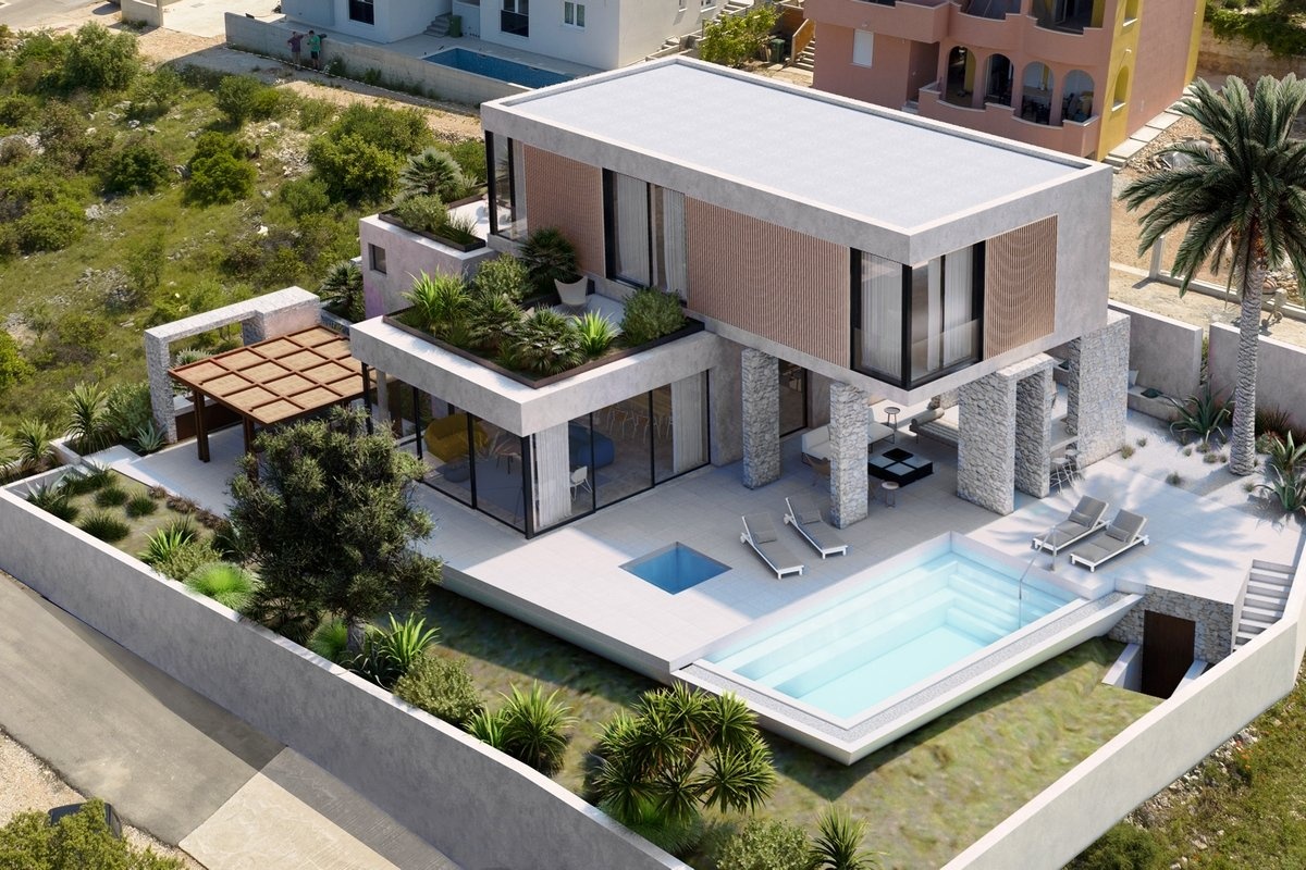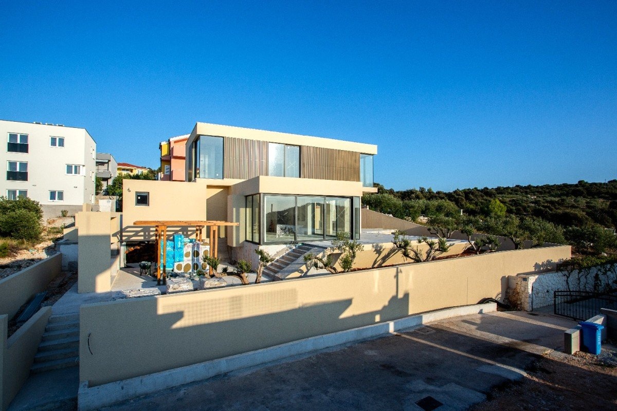 Nabízíme k prodeji moderní vilu s bazénem a výhledem na moře v Rogoznici – vila je aktuálně ve výstavbě. Tato pečlivě navržená moderní vila se nachází na mírně vyvýšeném pozemku o ploše 687 m², což umožňuje nerušený výhled na moře a okolní středomořskou krajinu. Celková užitná plocha domu bude 246 m² a vila je plánována jako jedna obytná jednotka se dvěma podlažími a podzemním prostorem, s plochou střechou, která umožňuje instalaci solárních panelů, kolektorů a dalších technologií.