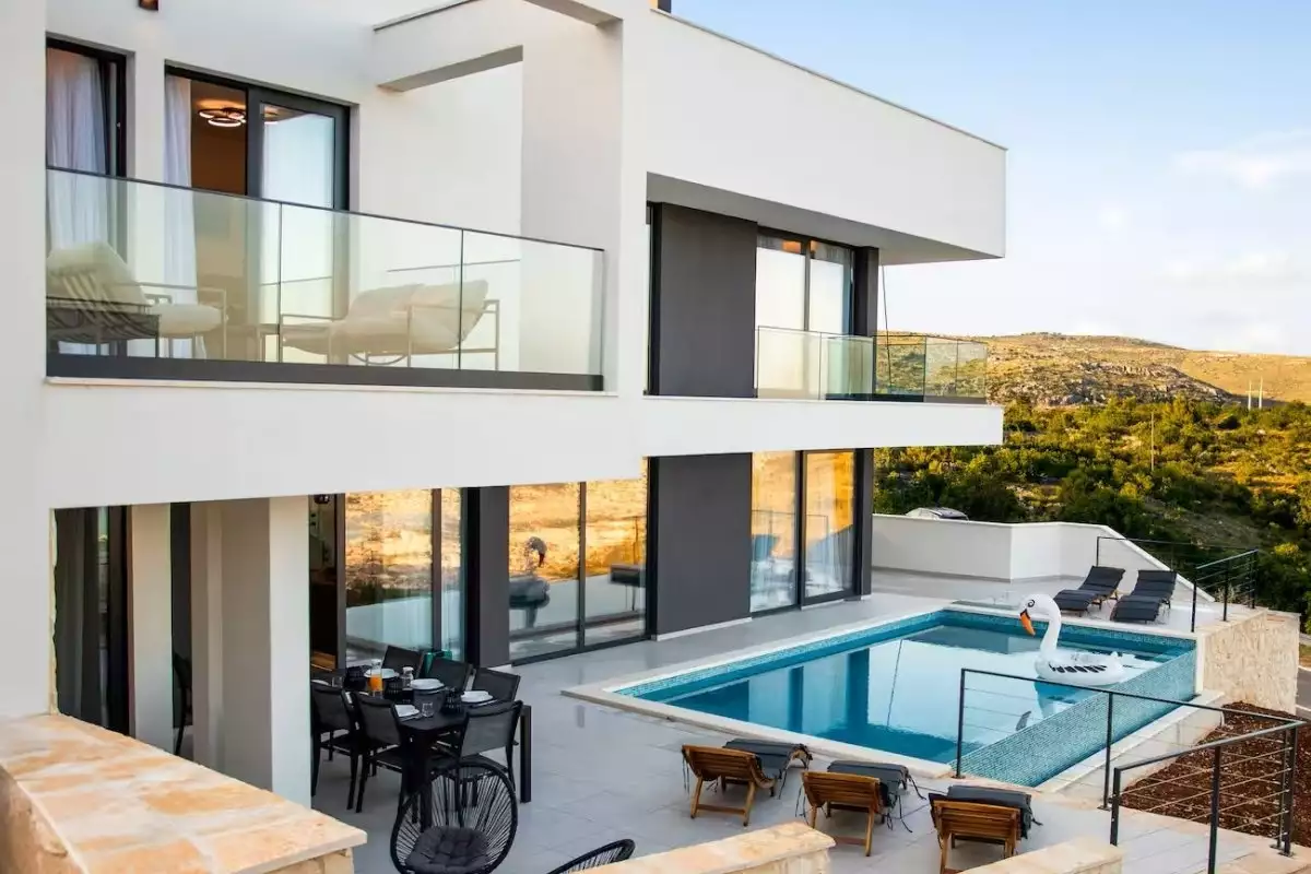Silnou stránkou této vily je nejen moderní design, ale i výhledy, které jsou dostupné téměř z každého koutu domu. Lokalita nabízí klid a soukromí daleko od ruchu města a přesto je velmi dobře dostupná – v blízkosti jsou město Trogir, letiště, dálniční spojení a veškerá občanská vybavenost.