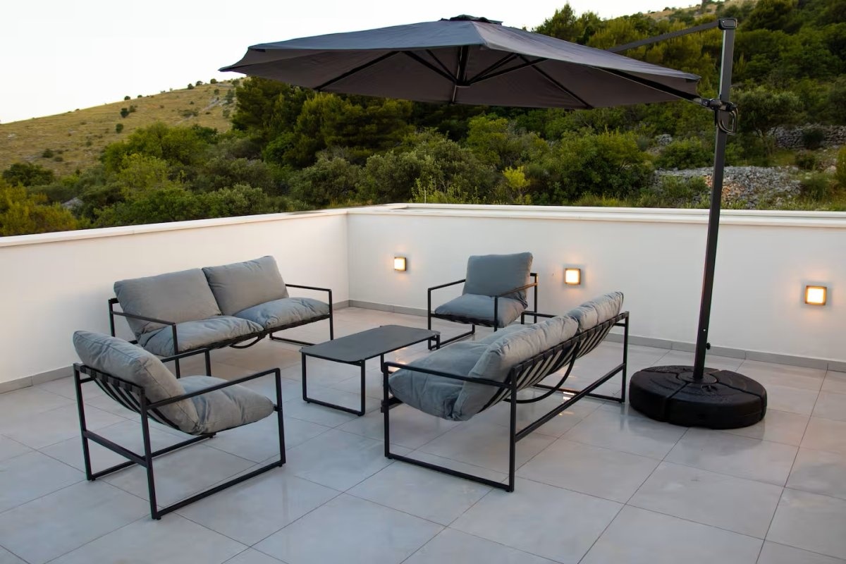 Vrcholovou část domu tvoří otevřená panoramatická terasa s úchvatným výhledem, která nabízí jedinečné místo pro relaxaci a vychutnání si scenérií zálivu a okolních ostrovů. V exteriéru vily dominuje bazén se sluneční terasou a kryté odpočinkové zóny, které poskytují ideální prostor pro relaxaci a společenské chvíle s rodinou či přáteli.