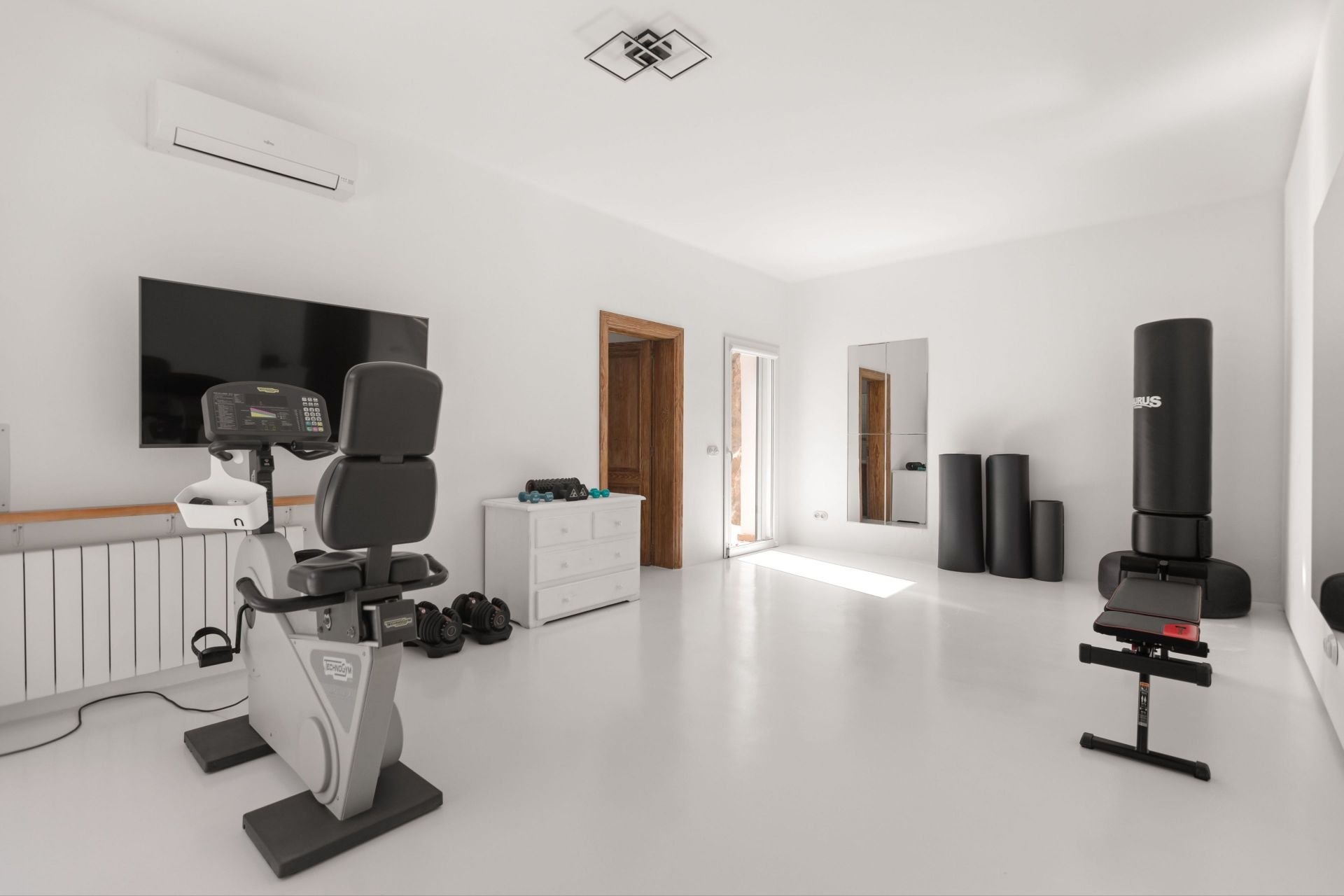 Vila je dvoupodlažní a pyšní se elegantně navrženými velkorysými prostory. V prvním podlaží se nachází moderní kuchyně vybavená špičkovými spotřebiči značky Neff, která navazuje na snídaňový a jídelní kout s panoramatickými okny s překrásným výhledem na otevřené moře. Z velké terasy si můžete vychutnávat fascinující západy slunce. Jsou zde čtyři prostorné ložnice, z nichž každá má vlastní koupelnu. Dále je zde i toaleta pro hosty. Koupelny jsou vyzdobeny mallorskými kameny. Nemovitost vyvolává pocit čistoty a vytříbeného vkusu, v němž se snoubí moderní luxus s půvabem středomořské estetiky. Budova disponuje klimatizací a podlahovým vytápěním. Součástí vily je také posilovna.
