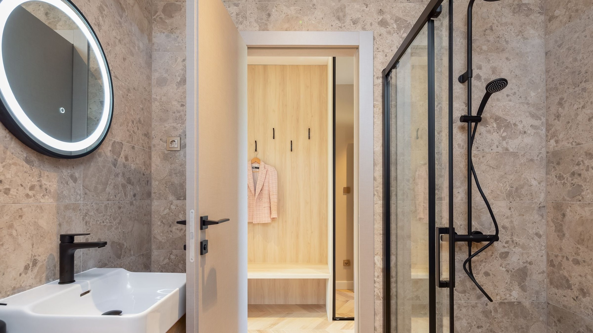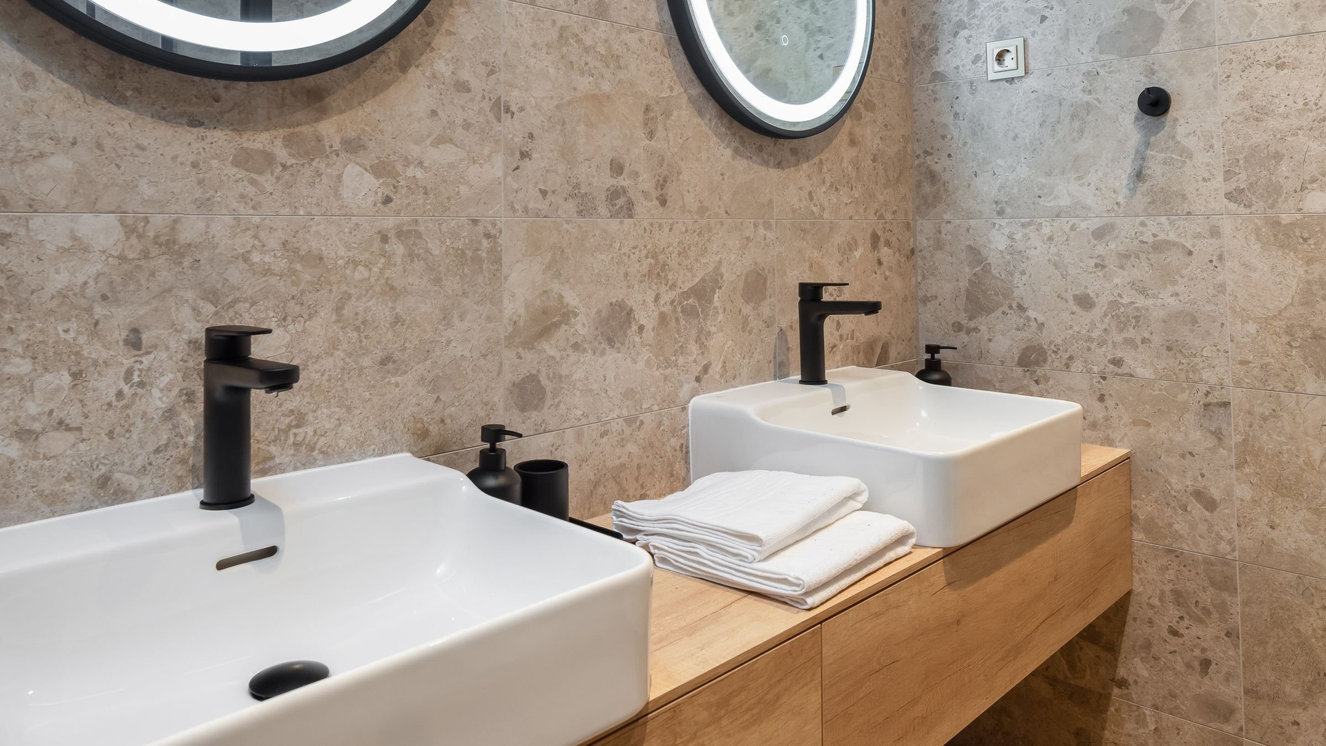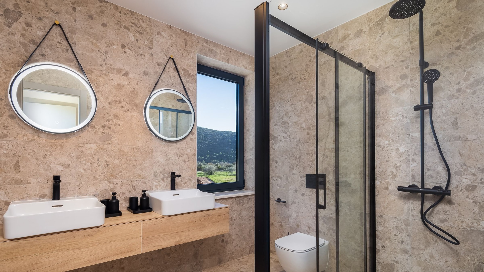 Vila disponuje celkovou obytnou plochou 310 m² a je situována na prostorném pozemku o výměře 7 000 m². Skládá se ze dvou nadzemních podlaží a je rovněž podsklepená. V přízemí se nachází moderně vybavená kuchyně s jídelnou, prostorný obývací pokoj s výhledem na venkovní část a jedna koupelna. První patro nabízí pět ložnic, z nichž každá má svou vlastní koupelnu, což zajišťuje maximální soukromí a komfort.