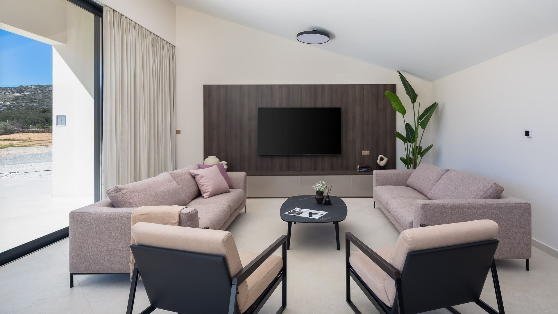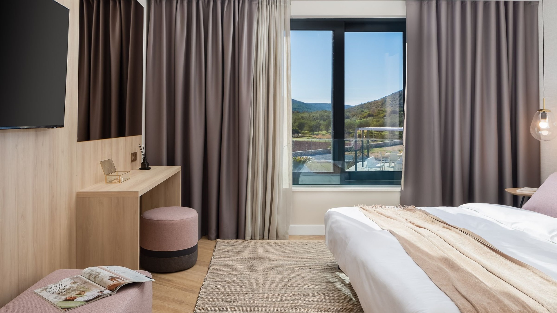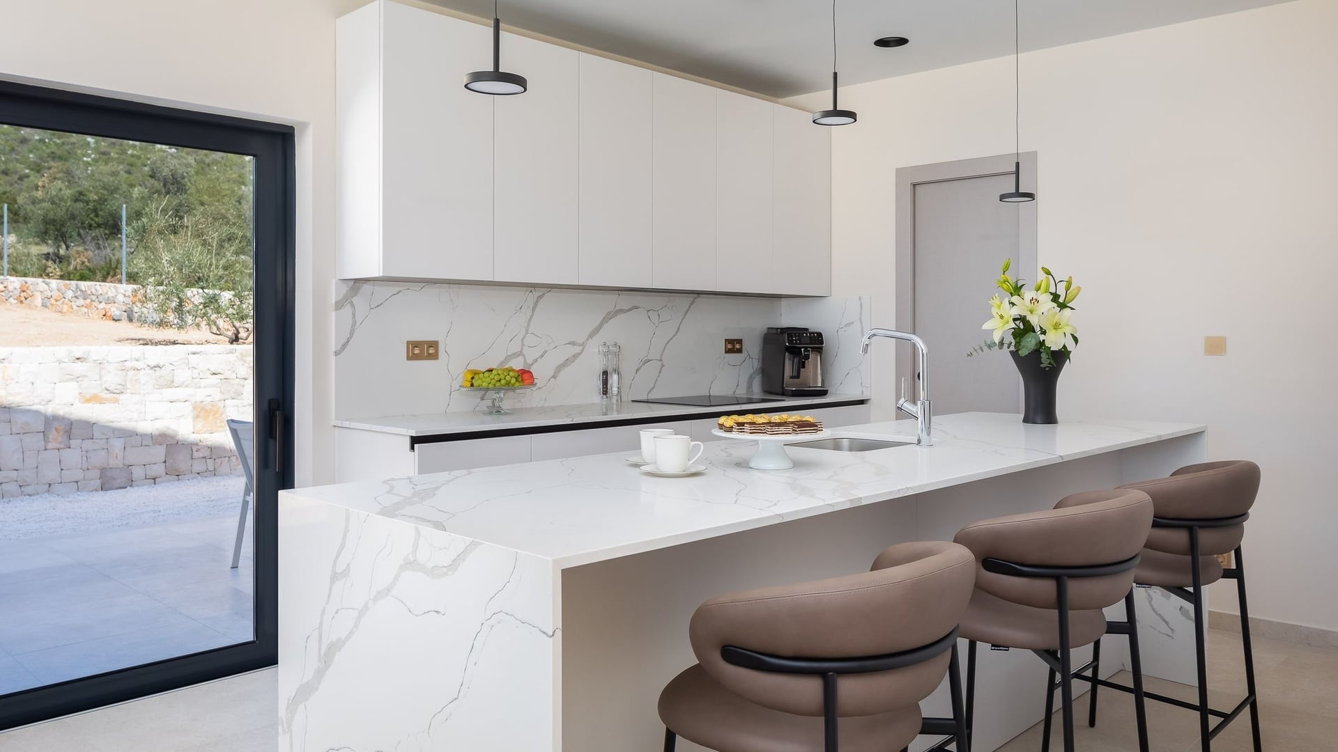 Součástí exteriéru je venkovní bazén o ploše 66 m² a krytá jídelna, která je ideální pro letní posezení. Vila je obklopena upravenou zahradou s typickými středomořskými rostlinami a nabízí ničím nerušený výhled do okolní přírody. K nemovitosti náleží také garáž o velikosti 35 m² se dvěma parkovacími místy a další dvě venkovní stání.