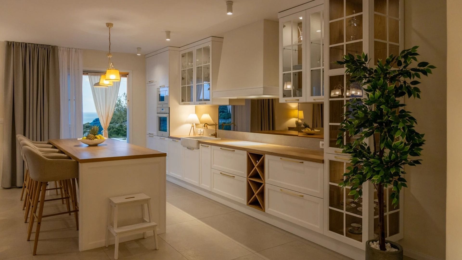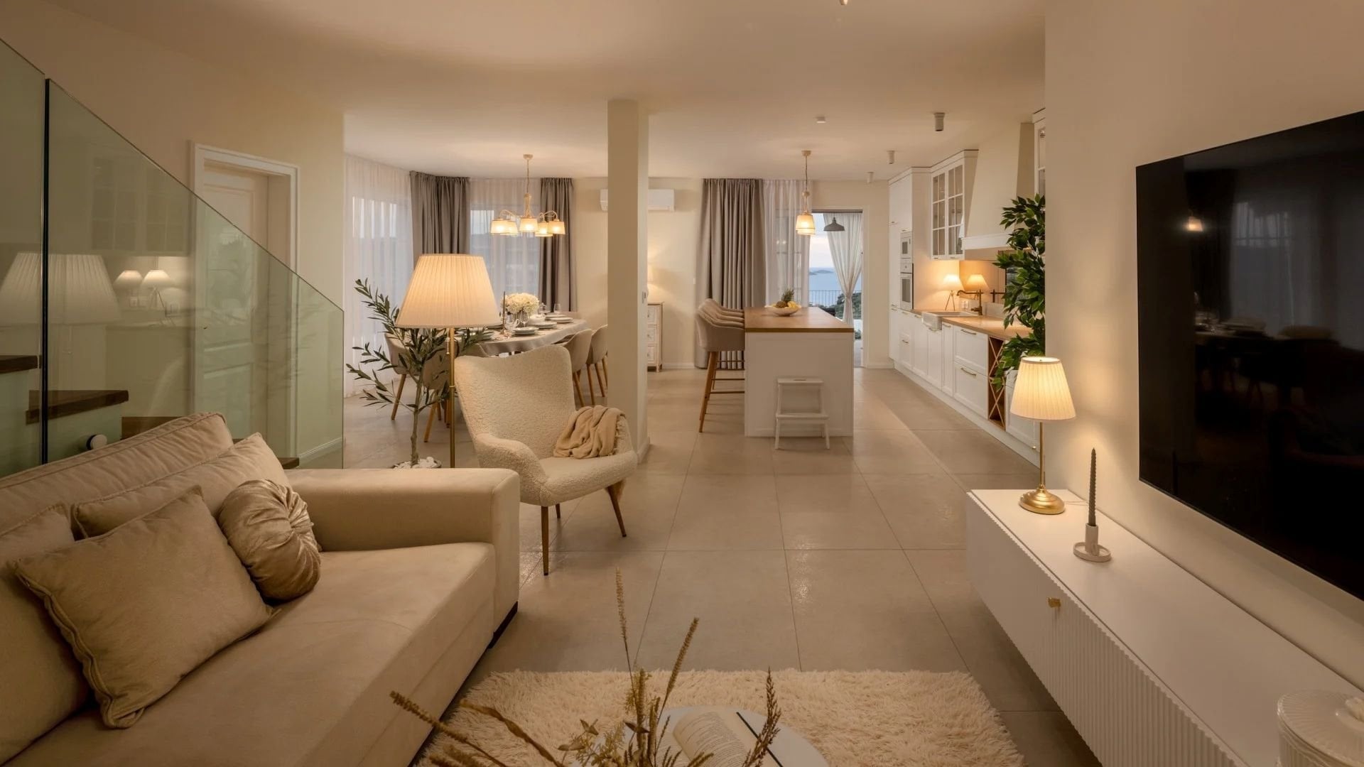 Vila postavena v roce 2024, byla navržena a vybudována s použitím nejkvalitnějších materiálů, což zaručuje vysoký standard pohodlí a luxusu. Nemovitost se rozkládá na dvou podlažích, přičemž přízemí zahrnuje kuchyni propojenou s obývacím pokojem a jídelnou, toaletu pro hosty, prádelnu a jednu ložnici. V patře jsou tři ložnice, z nichž dvě mají vlastní terasu, což umožňuje vychutnávat si čerstvý vzduch a krásné výhledy.