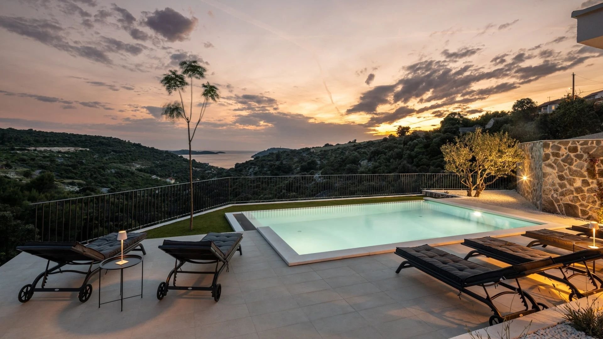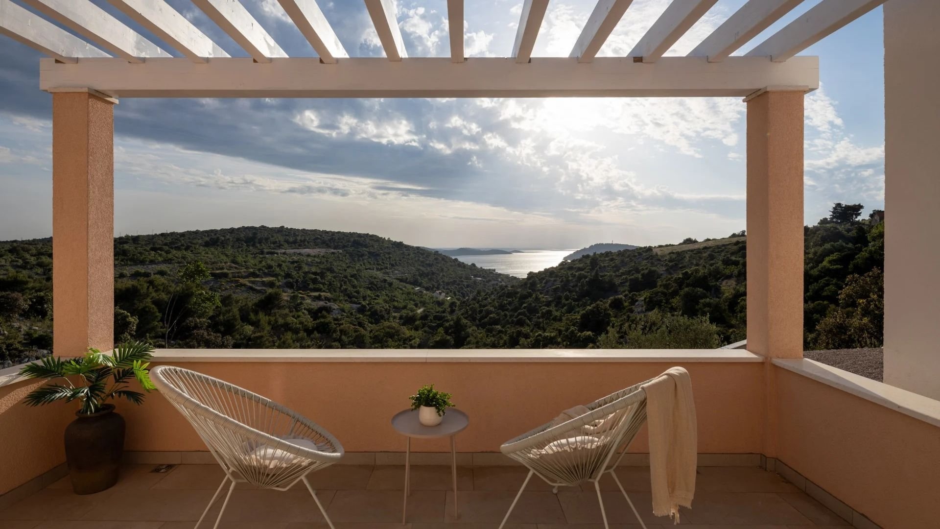 Nabízíme k prodeji luxusní vilu s bazénem a nádherným otevřeným výhledem na šibenické souostroví. Tato nově postavená nemovitost se nachází na výjimečném a klidném místě, ideálním pro ty, kteří hledají soukromí a okouzlující výhledy na západy slunce. Vila je umístěna v naprosté izolaci, s jedinou nemovitostí v okolí, což zaručuje maximální soukromí a klid.
