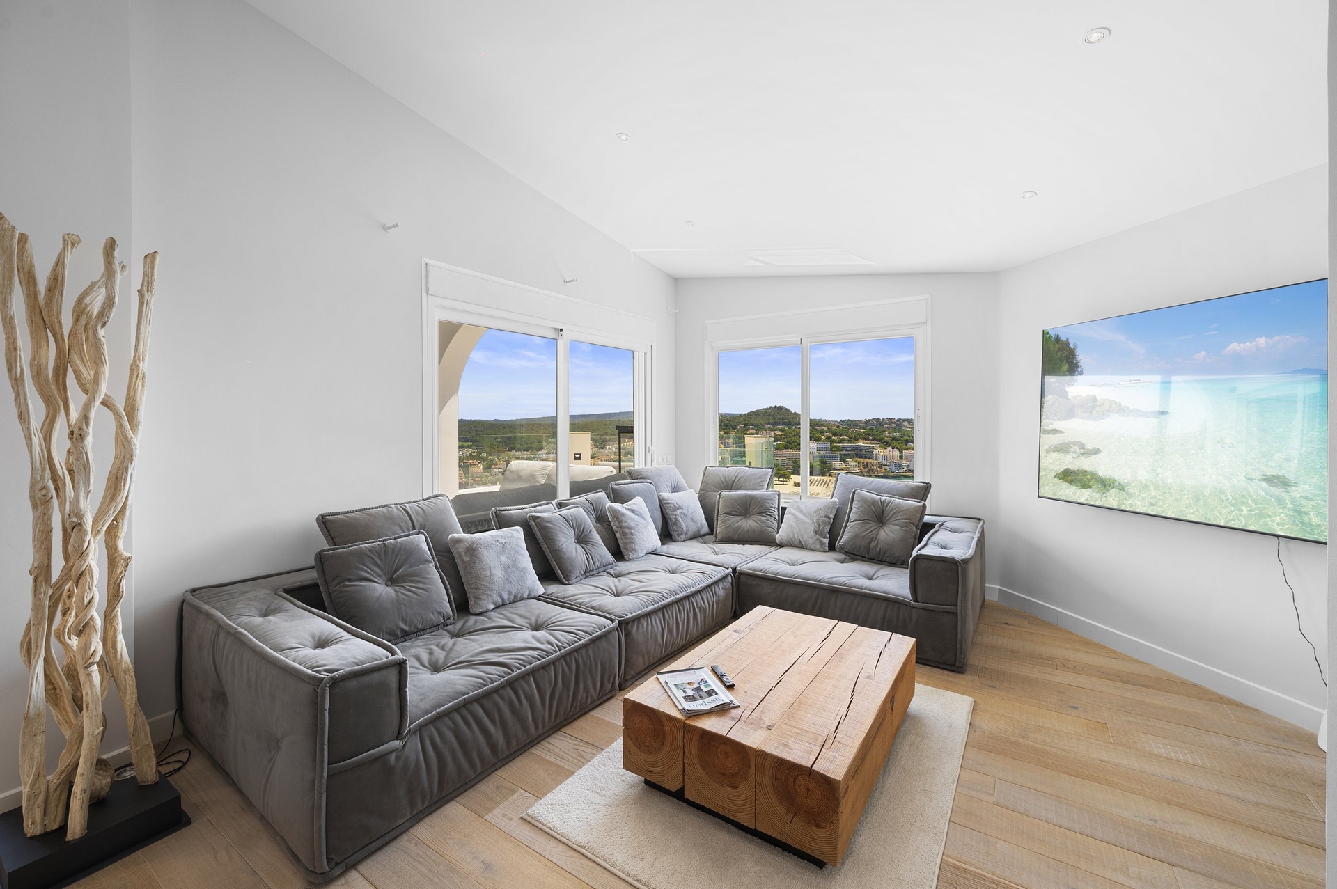 Prostorný a otevřený obývací pokoj s jídelnou je ideální pro společenské akce, a moderní kuchyně je vybavena špičkovými spotřebiči včetně vinotéky, trouby Miele, varné desky Bora s ostrůvkovým řešením, dvou velkých kombinovaných lednic s mrazničkou, myčky na nádobí, kávovaru Miele a šuplíky na ohřev nádobí. Částečně krytá terasa nabízí skvělé místo k odpočinku s nádherným výhledem.