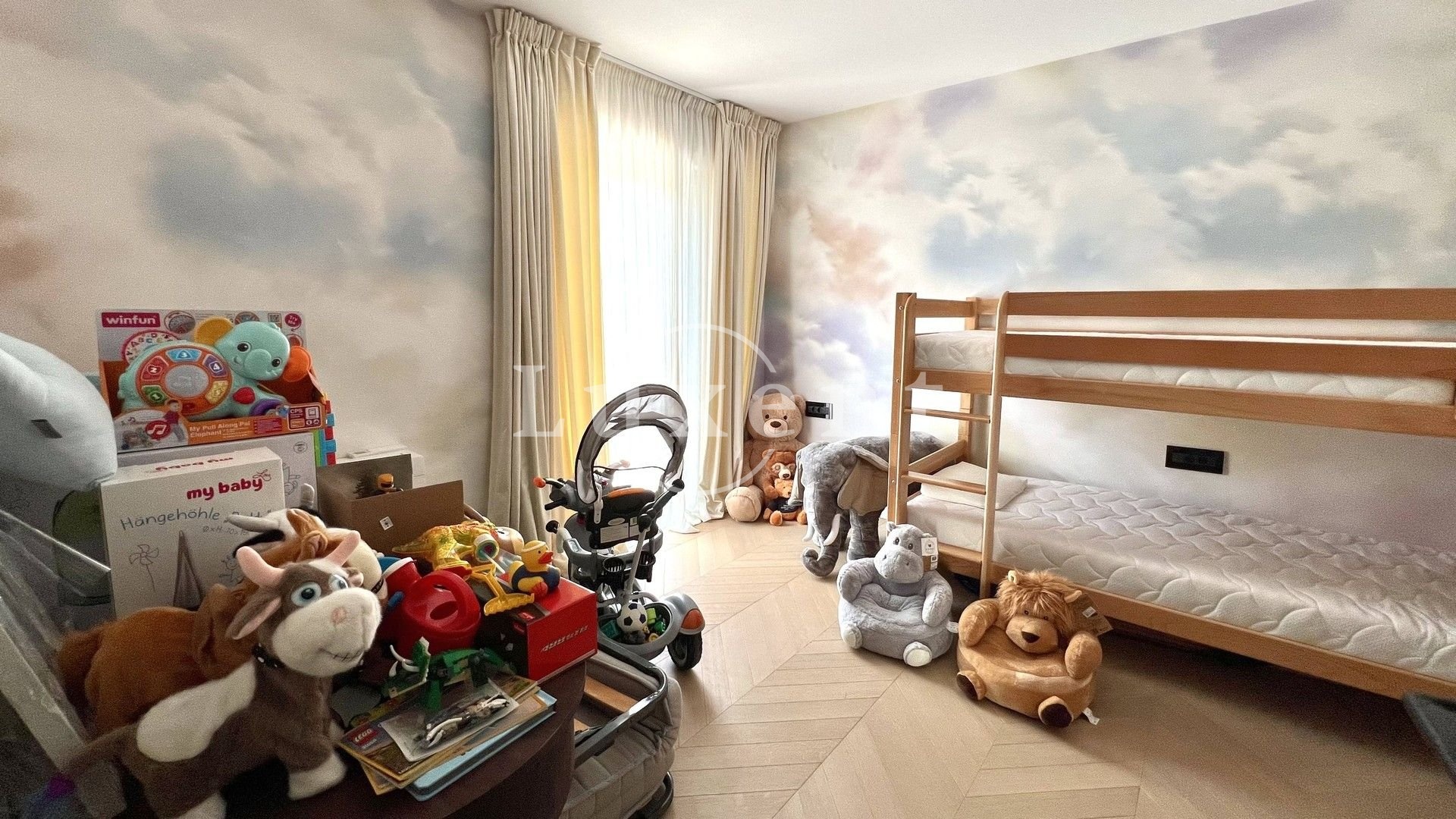 Po vnitřním schodišti se dostaneme do patra, kde jsou umístěny tři ložnice. Dětský pokoj má vlastní balkon, hlavní ložnice disponuje prostornou šatnou, vlastní koupelnou a soukromým balkonem. V patře se nachází také druhá koupelna s vířivou vanou a samostatná toaleta. Celkově vila nabízí dostatek prostoru a soukromí pro každého člena domácnosti.
