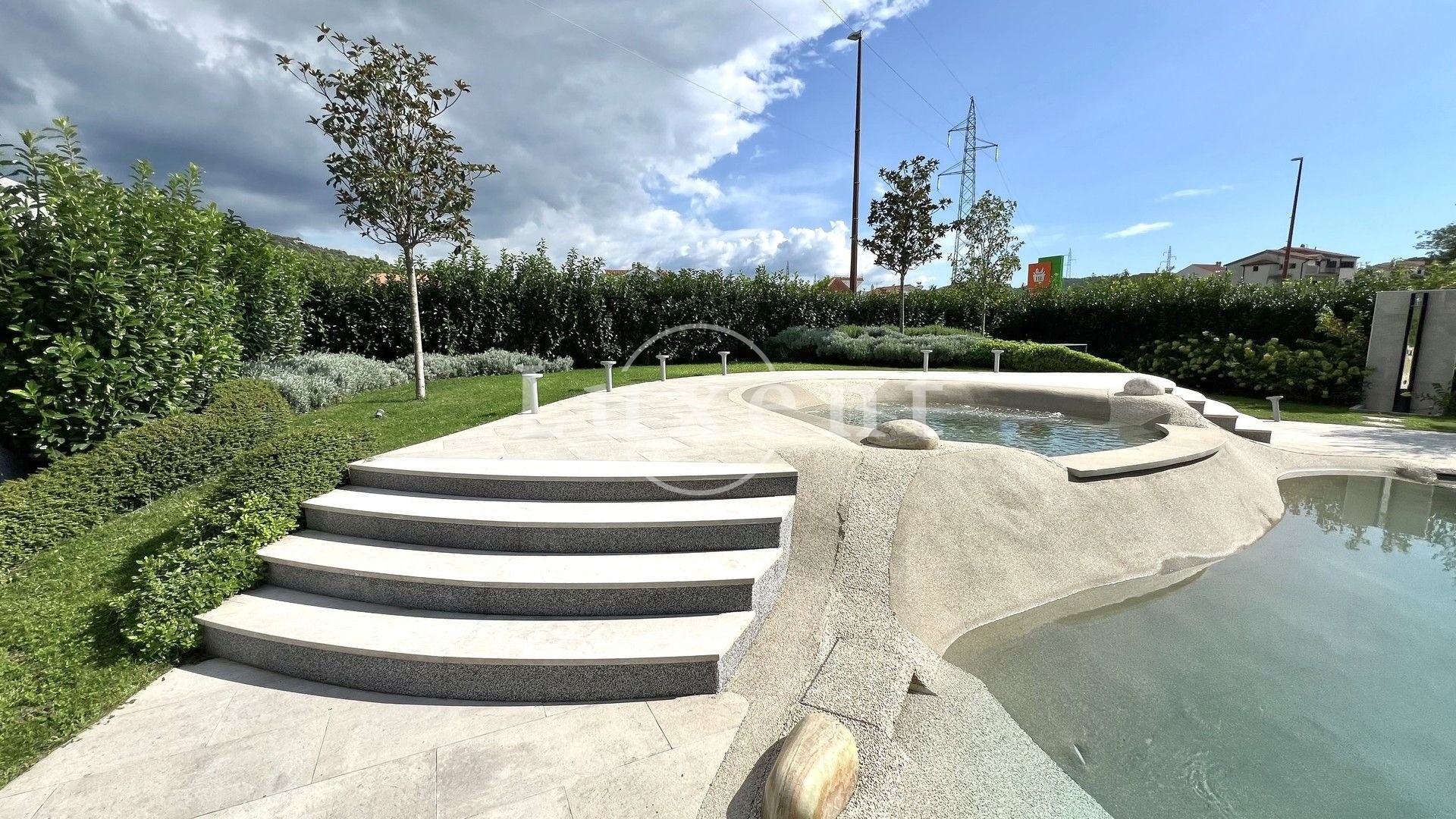 Exteriér nemovitosti je stejně působivý jako interiér. Na pozemku je umístěn venkovní bazén, vířivka s unikátní konstrukcí, venkovní kuchyně, sprcha a krytá terasa pro posezení. Parkování je zajištěno dvojgaráží a až devíti venkovními parkovacími místy. Celý pozemek je oplocen a poskytuje absolutní soukromí.