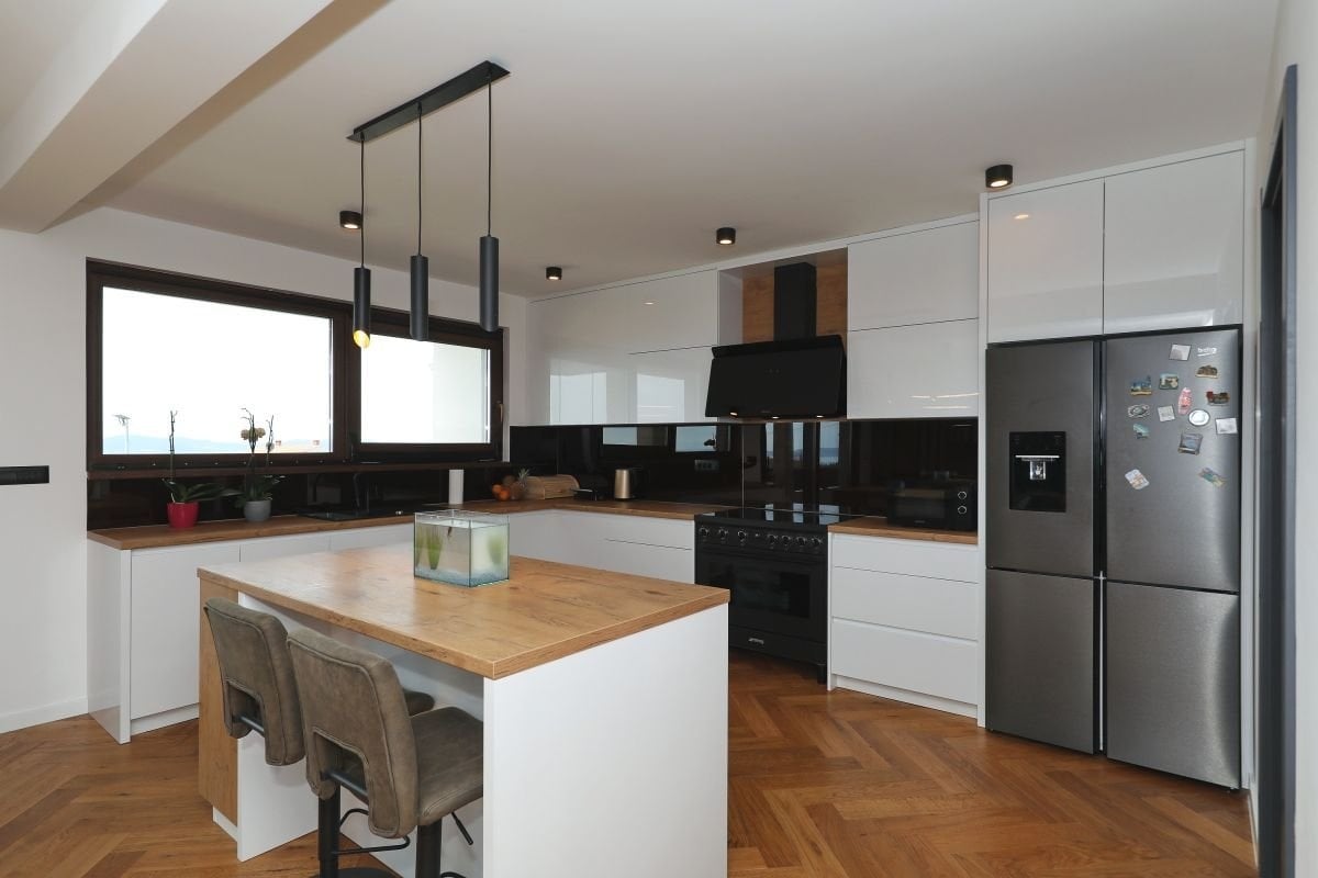 Při výstavbě byly použity nejkvalitnější materiály, interiér i nábytek jsou sladěny v nadčasovém stylu s důrazem na detaily a komfort. Každá místnost je vybavena podlahovým vytápěním a klimatizací, což zaručuje pohodlí po celý rok. Venkovní parkování pojme více vozidel a v dvojgaráži je dostatek prostoru pro další dvě auta.