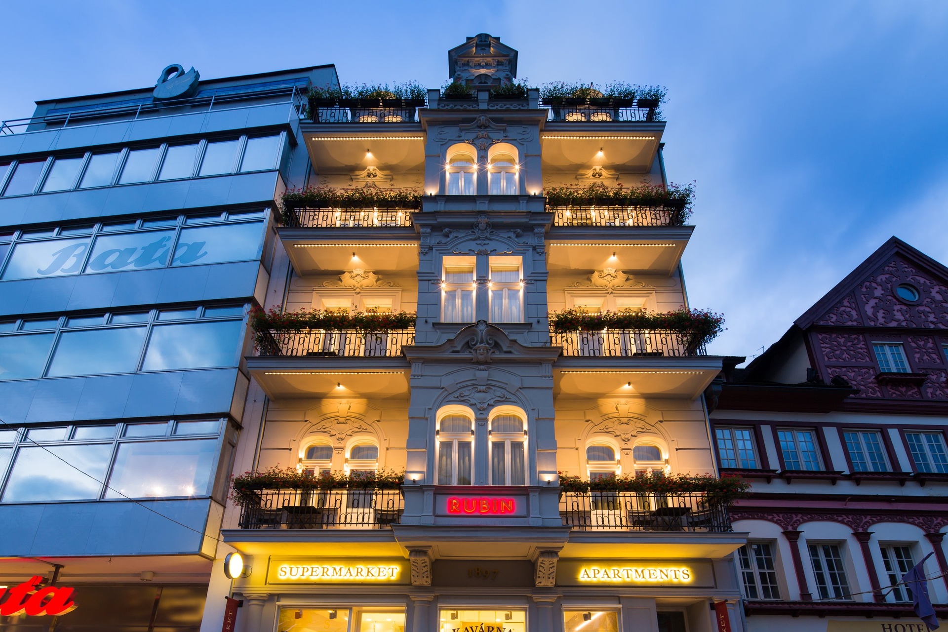 Byty jsou útulné a premiově zařízené italským nábytkem včetně kuchyně, osvětlení i nábytku a mají své balkony nebo klidné terasy s orientací do stylového dvora nebo na kolonádu. Dva z horních bytů jsou mezonetového typu. V jednom z bytů ve 2.NP je špičkové SPA se saunami, odpočívárnou a terasou k užití pro uživatele bytů. V přízemí je úspěšně provozována restaurace. V suterénu je pak technické zázemí. Dům byl postaven v r. 1897 podle karlovarského architekta Karla Hellera. Jako památkově chráněný byl v r. 2016 kompletně zrekonstruován podle italského inženýra Stefana Stramigioli a dokončen architekty ateliéru Soukup.