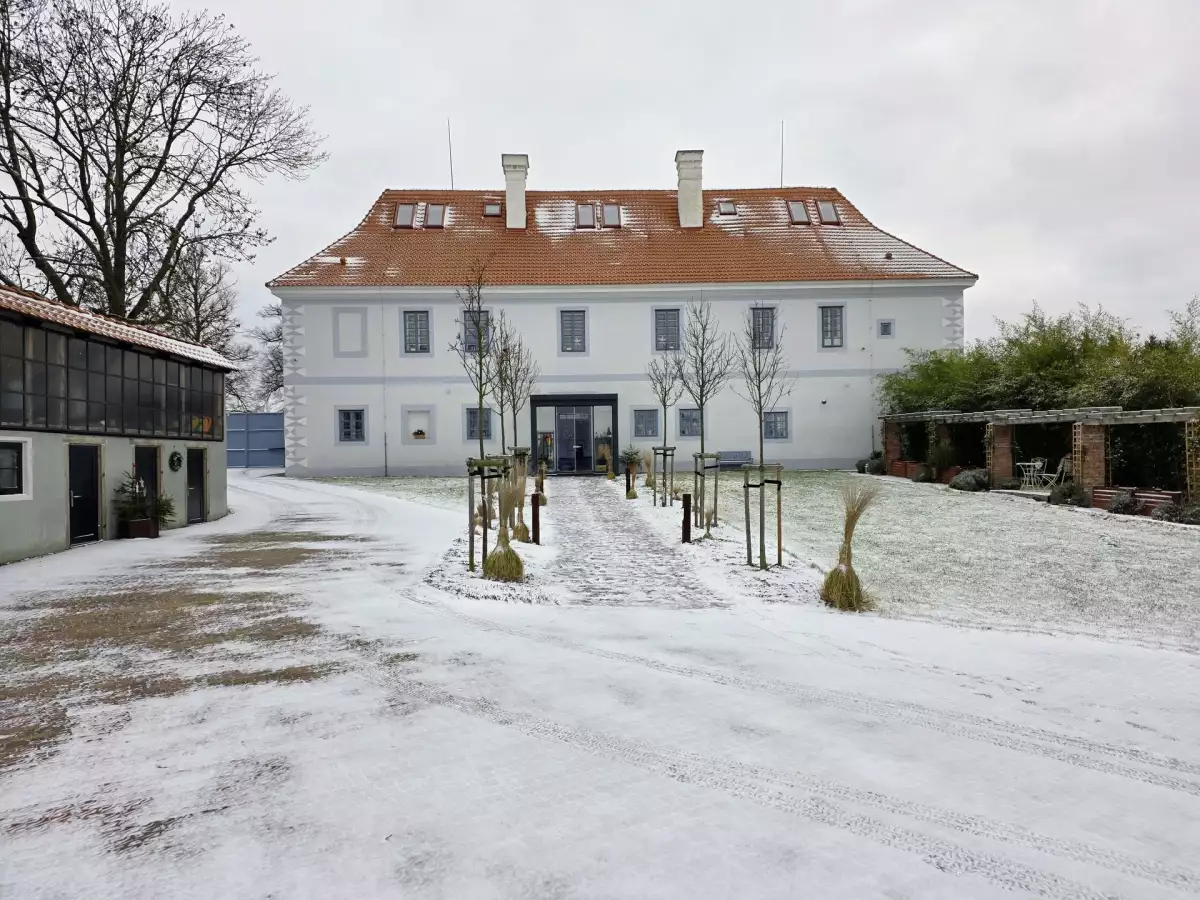 Areál je majestátně ohraničen masivní kamennou zdí, která mu dodává soukromí a exkluzivitu. Vjezd do zámeckého nádvoří střeží impozantní automatická kovová brána. Přední část pozemku tvoří elegantní formální. U zámecké stodoly se nachází keramický bazén s automatikou a protiproudem pro Budovami obklopené nádvoří s ústřední ocelovou plastikou plynule přechází v komorní park obklopující zarybněný rybník, lemovaný vzrostlými stromy, s molem a stylovým posezením u ohniště s grilem.