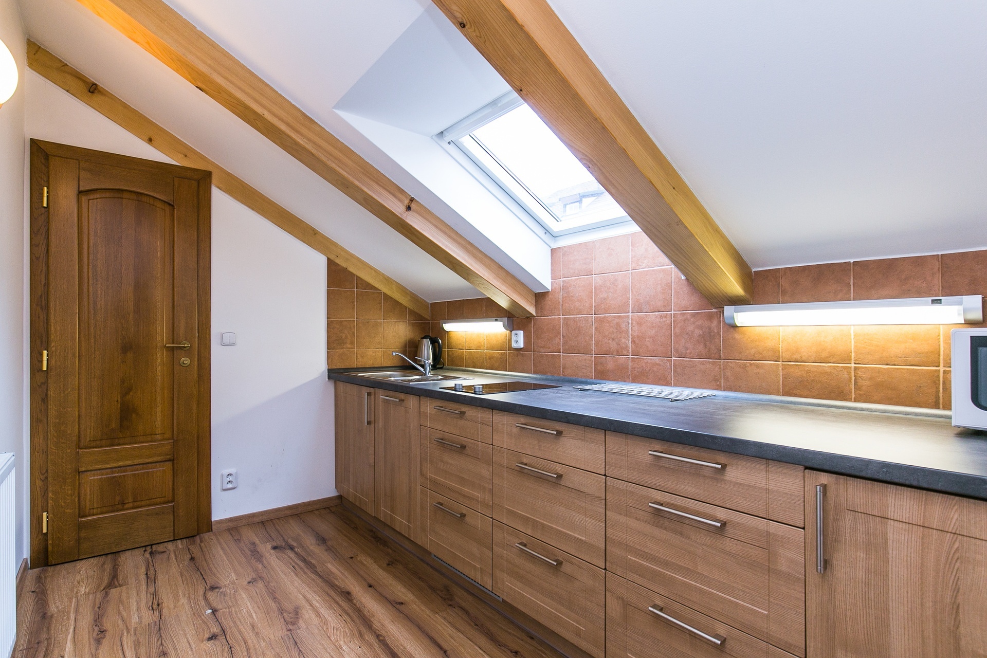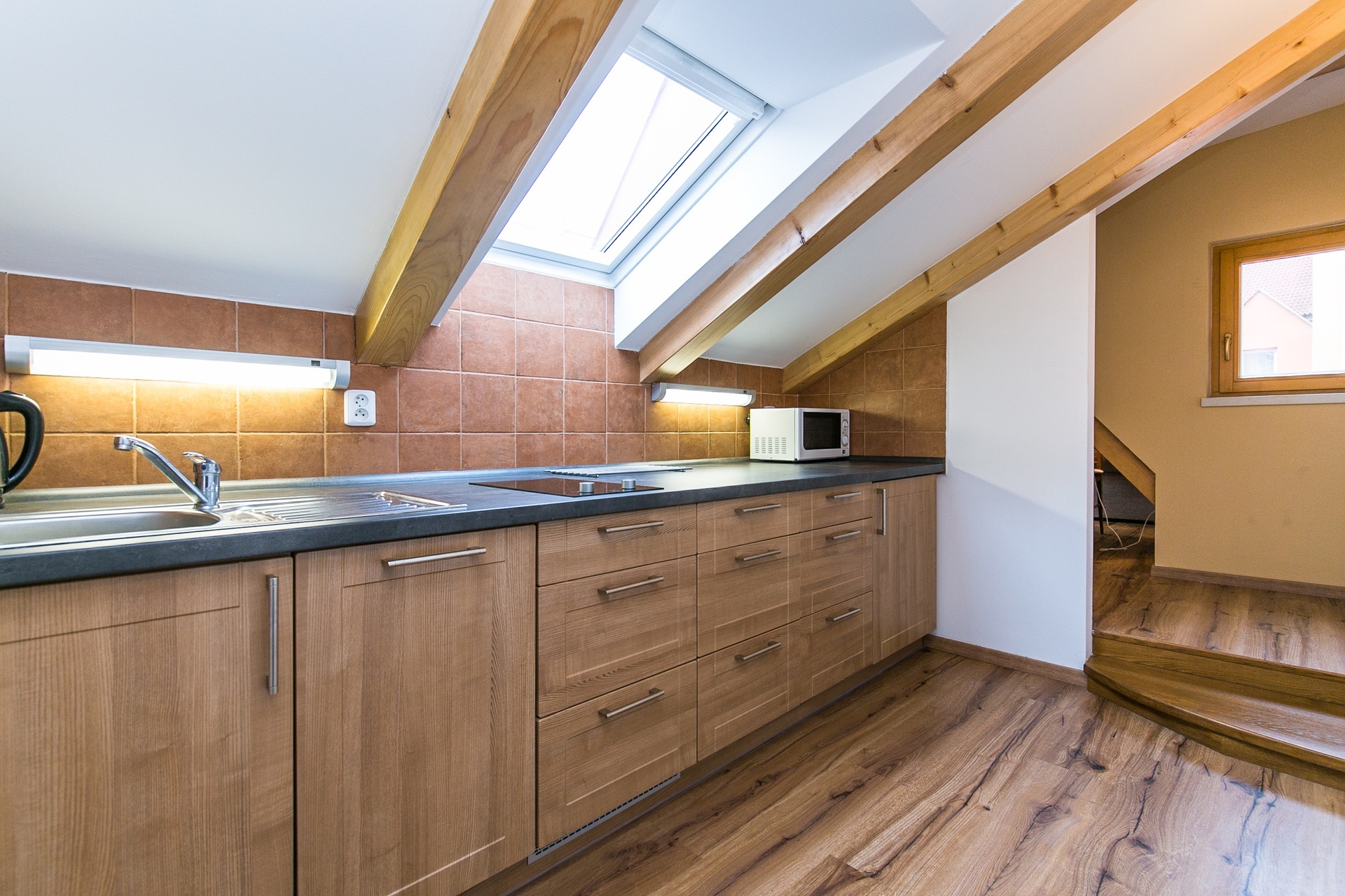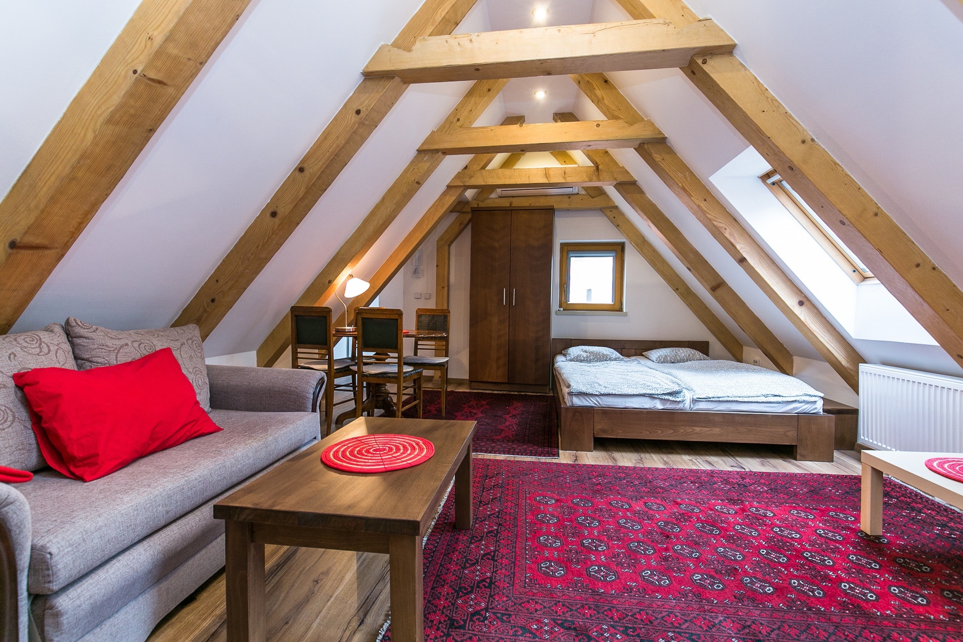 Dispozice zahrnují vstupní chodbu, prostorný pokoj s manželskou postelí, pohovkou, jídelním a pracovním stolem, moderní kuchyň (indukční varná deska, lednice, myčka, mikrovlnná trouba) a koupelnu se sprchovým koutem a toaletou. Historický dům z roku 1586 je zapsaný jako kulturní památka s množstvím originálních prvků. Objekt byl přestavěn barokně na konci 17. století. Úprava vnitřních dispozic a fasáda je provedena klasicistním stylem z 1. čtvrtletí 19. století.
