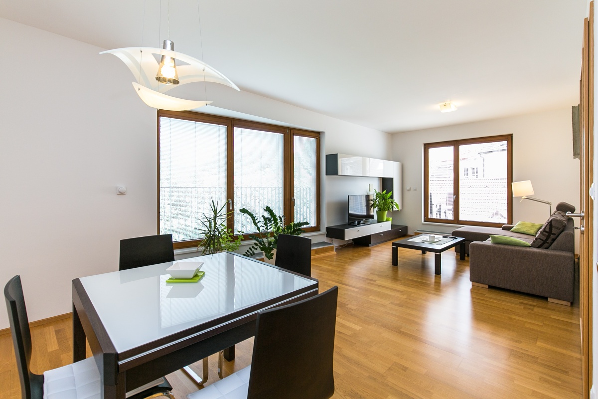 Dispozice zahrnují vstupní chodbu, prostornou šatnu s úložnými prostory, ložnici, obývací pokoj s kuchyňským koutem a jídelním stolem. Kuchyň je vybavena všemi spotřebiči – indukční varná deska, digestoř, kompaktní trouba včetně mikrovlnky, myčka a lednice s mrazákem. V koupelně je vana s toaletou, dvě umyvadla a pračka. Z obývacího pokoje i ložnice je vstup na terasu s posezením, která je orientována na jih. Dřevěná podlaha a dlažba, bezpečnostní dveře, kvalitní francouzská okna, televize. K dispozici je také sklep, v případě zájmu zajistíme pronájem parkovacího stání v garáži.