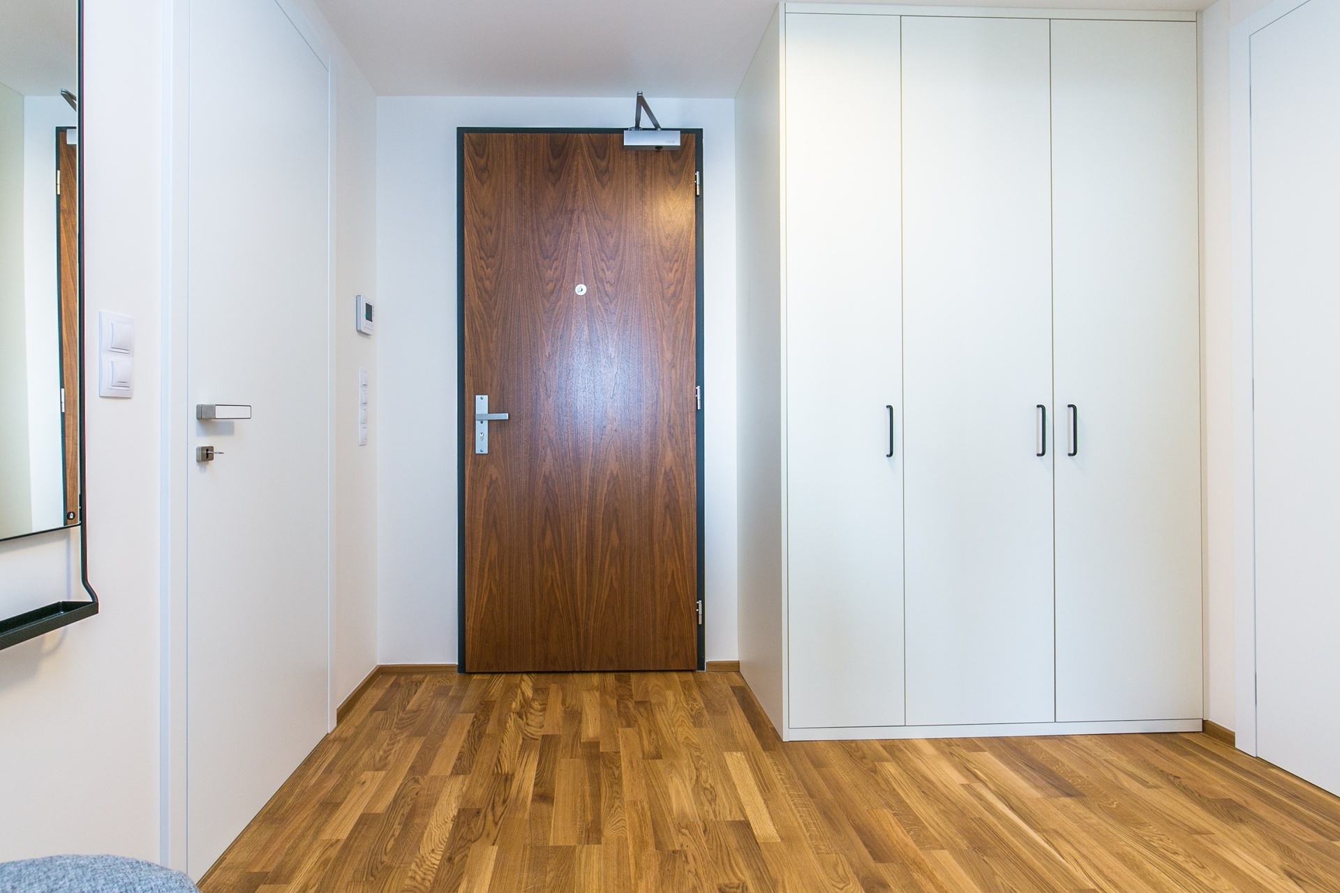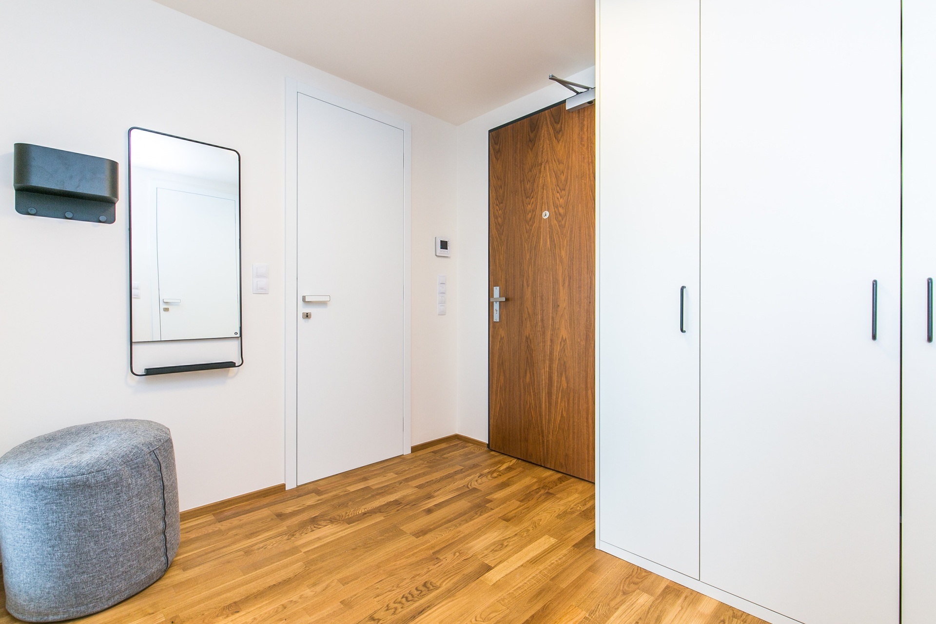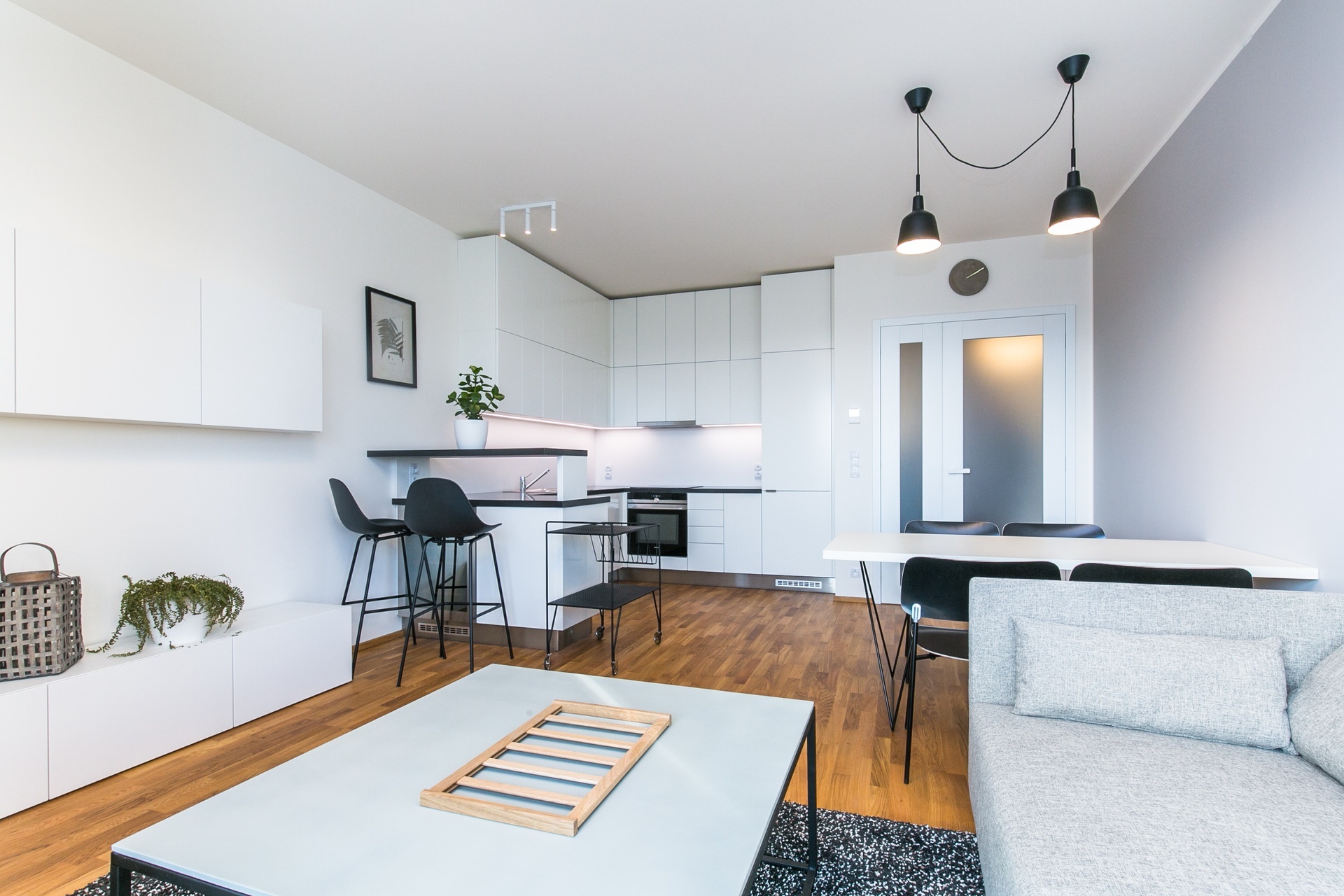 Dispozice zahrnují vstupní chodbu, ložnici, obývací pokoj s kuchyňským koutem a jídelním stolem, komoru, koupelnu s vanou a toaletou. Kuchyň je vybavena všemi spotřebiči – indukční varná deska, digestoř, horkovzdušná trouba, myčka, lednice s mrazákem a bar s vinotékou.