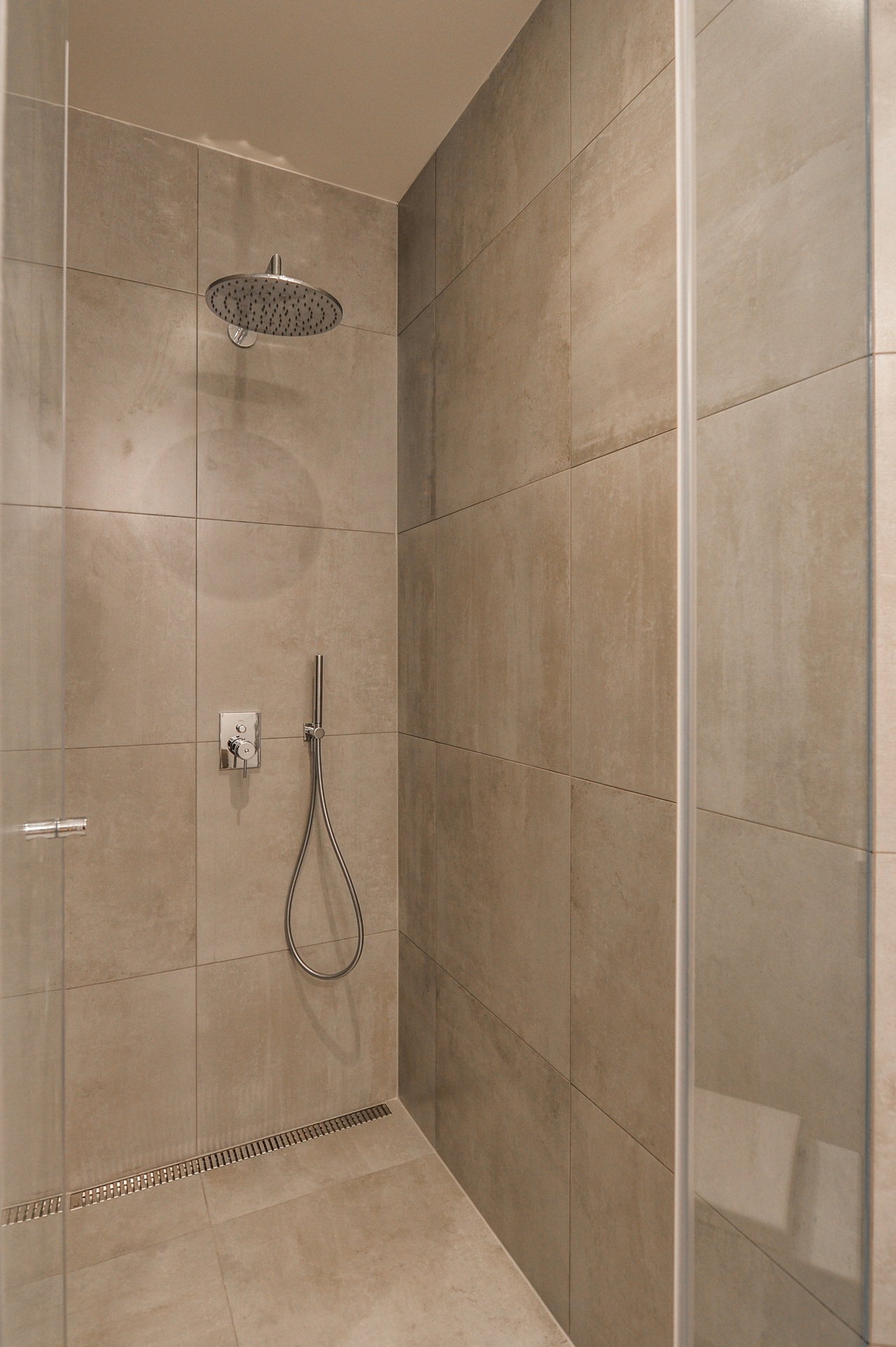 Dispozice nabízí vstupní chodbu, koupelnu se sprchovým koutem, toaletou a bidetem, master ložnici s en suite koupelnou se sprchovým koutem a toaletou, další ložnici a prostorný obývací pokoj s kuchyňským koutem vybaveným všemi spotřebiči – indukční varnou deskou, digestoří, horkovzdušnou troubou, myčkou a lednicí s mrazákem. Součástí vybavení je i pračka se sušičkou.
