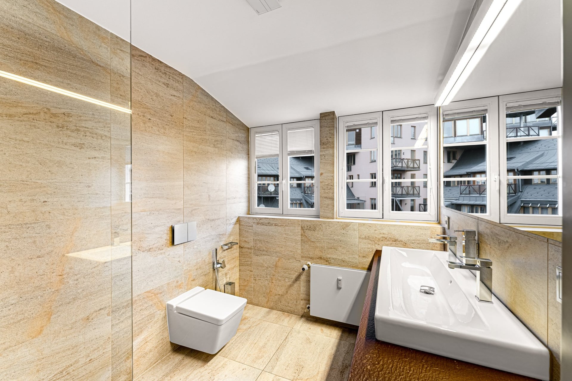 V horním patře bytu se rozkládá prostorný obývací pokoj s příjemnou terasou a otevřenými výhledy. Součástí horního patra bytu je dále plně vybavená kuchyně, jídelní část a odpočinková zóna s koženou sedací soupravou, krbem a kvalitním audio systémem a televizí. V jídelně je vinotéka a jídelní stůl se šesti židlemi. V této části bytu se rovněž nachází koupelna s oknem, walk-in sprchovým koutem a toaletou a dále samostatná komora s úložnými regály, pračkou a sušičkou.