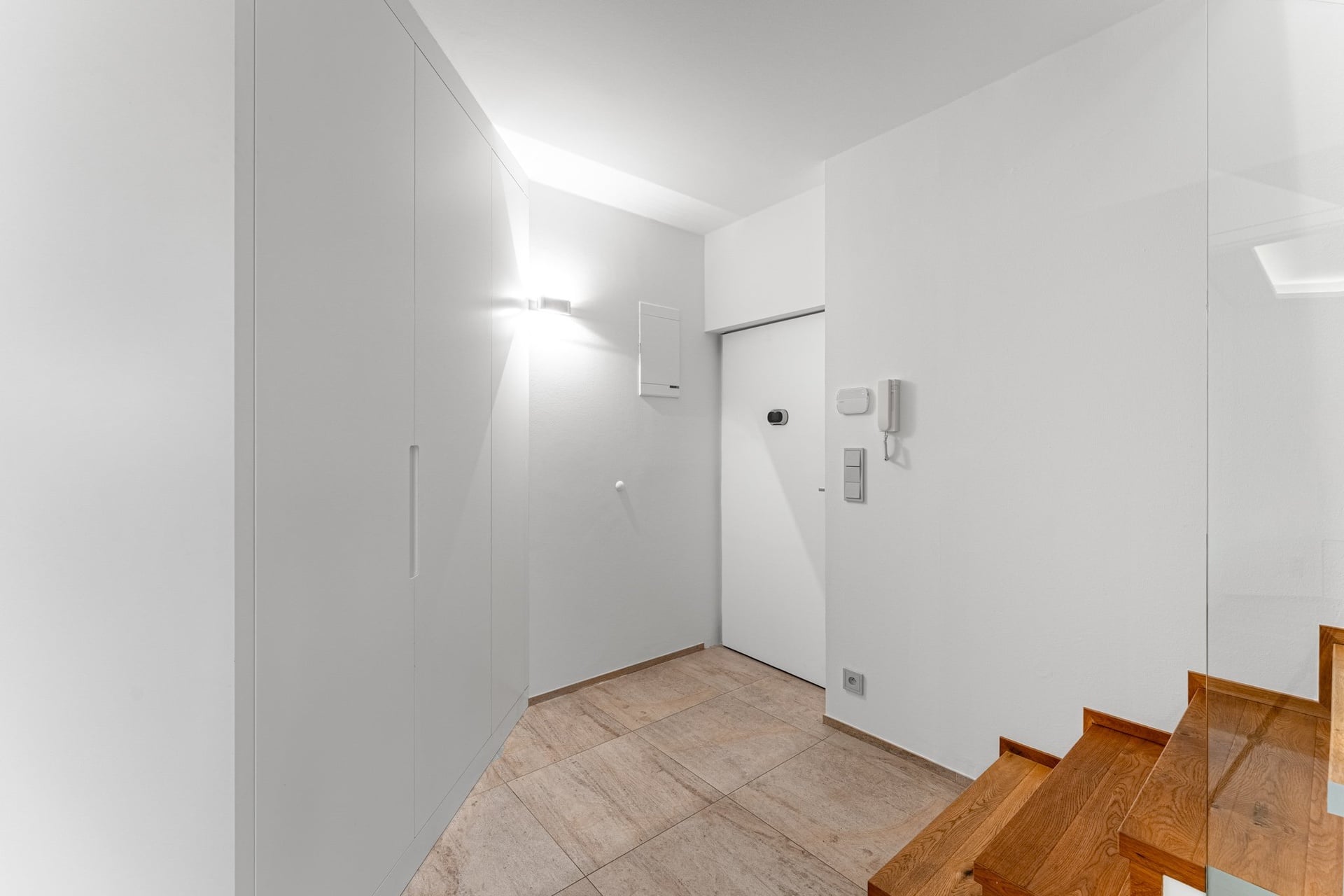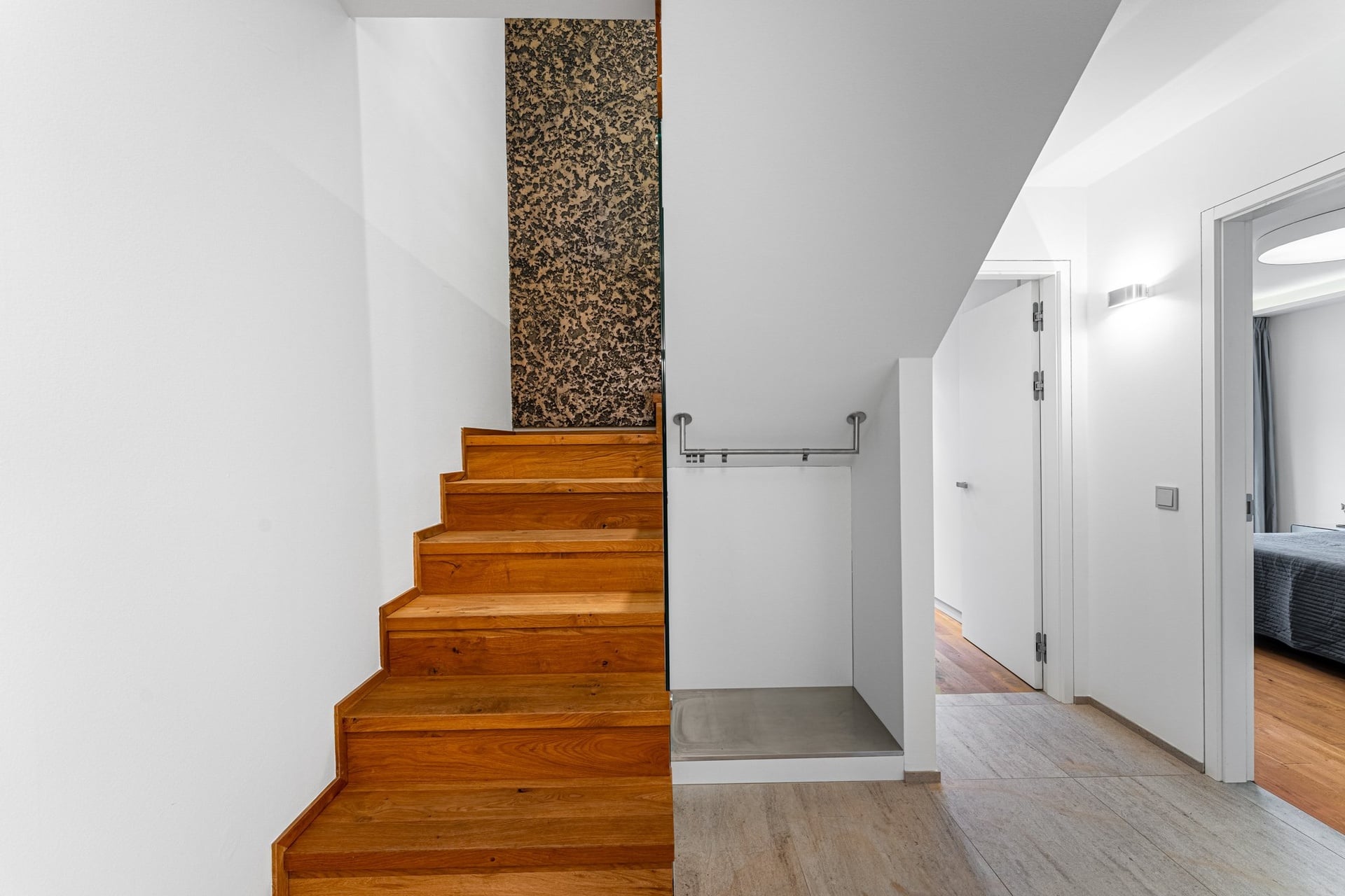 Ve spodní úrovni se nachází menší vstupní hala se schodištěm, vestavěnými skříněmi a vchody do dvou samostatných vybavených ložnic – obě s vestavěnými skříněmi. K hlavní ložnici patří navíc terasa s výhledem do klidného zeleného vnitrobloku.