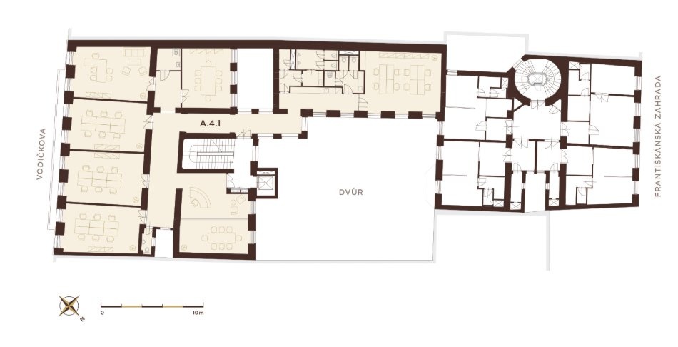K pronájmu nabízíme kancelářské prostory o celkově výměře 399,5 m² v historické a přitom velmi moderní budově Residence Vodičkova 33 (dříve známé jako Vítkův dům). Budova prošla kompletní rekonstrukcí a nyní nabízí reprezentativní komerční prostory, které harmonicky spojují moderní technologie s jedinečným historickým kouzlem. Tato kombinace vytváří ideální pracovní prostředí v jedné z nejprestižnějších lokalit Prahy.