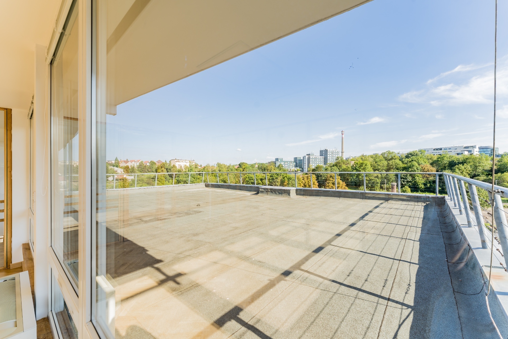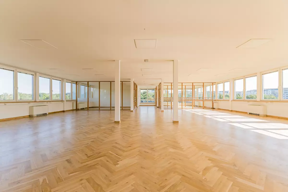 Kancelář se nachází v 5NP budovy s krásným výhledem do okolí, má terasu. Prostor skládá se z hlavního otevřeného prostoru 4 menších kanceláří oddělených skleněnými příčkami.