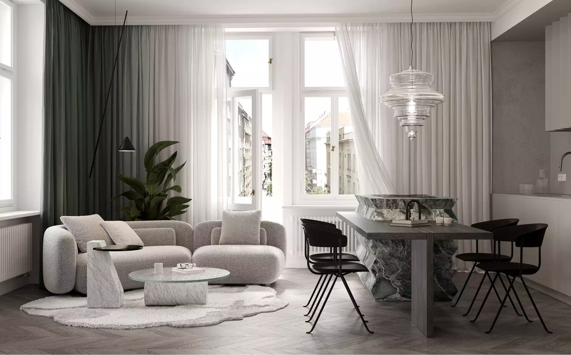 Projekt je navržen v kvalitním vysokém standardu. Obytný prostor doplňuje dřevěná podlaha FREVINI MONACO, pokládaná ve vzoru chevron. Interiérové dveře kombinují klasické dřevěné prvky s ocelovými skleněnými dveřmi se strukturovaným a čirým sklem, čímž podtrhují moderní charakter prostoru. Elektroinstalace je osazena designovými vypínači a zásuvkami JUNG LS 990. V bytě jsou instalována zapuštěná bodová svítidla McLED TORO a samozřejmostí je také nástěnná klimatizační jednotka pro zajištění komfortu v letních měsících. Koupelna je vybavena sanitou LAUFEN KARTELL, keramické obklady a dlažby EMIL CERAMICA v moderních odstínech dodávají koupelně nadčasový vzhled.