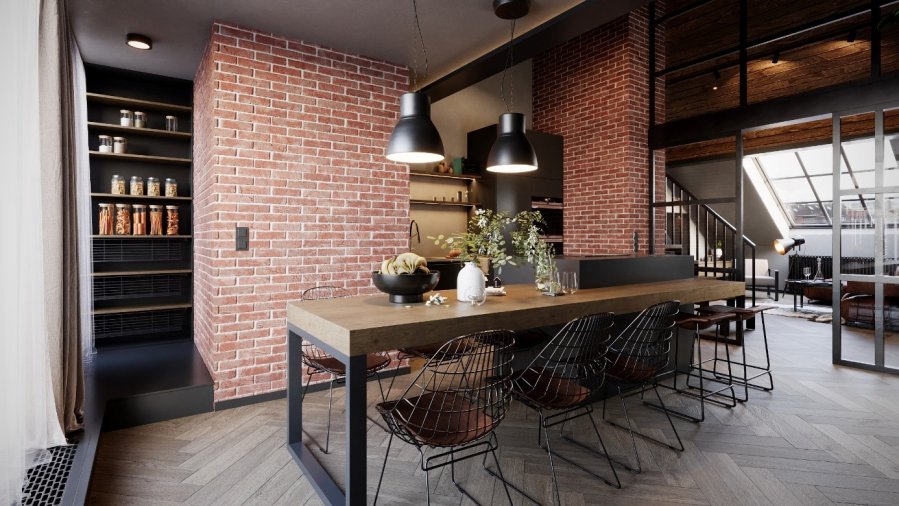 Centrem bytu je obývací pokoj spojený s kuchyní ve tvaru L, doplněnou o ostrůvek. V místnosti se nachází původní komínové těleso zachovávající kouzelnou loftovou atmosféru a zároveň zdůrazňující výšku celého prostoru. Za ním zároveň bylo vytvořeno útulné zázemí s otevřeným průhledem na galerii. Na ni vedou na míru vyrobené schody s vestavěným úložným prostorem. V hlavní ložnici vznikla nika pro praktickou vestavěnou skříň a prosklená koupelna s volně stojící rohovou vanou. Druhá koupelna se sprchovým koutem je pak přístupná z chodby bytu.