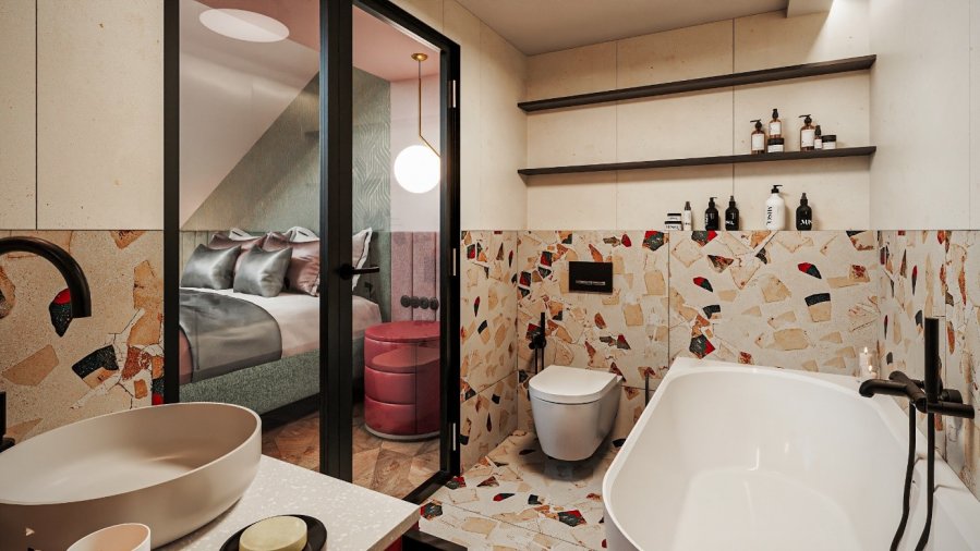 Punc exkluzivity dodávají interiéru luxusní podlahové krytiny a také velkoformátové obklady a dlažby v koupelnách a na chodbě, jež jsou inspirovány původním terazzem s bordó a béžovými odstíny. Jejich kombinace vám dává základ dalšímu nábytkovému dotvoření ve stylu art deco.