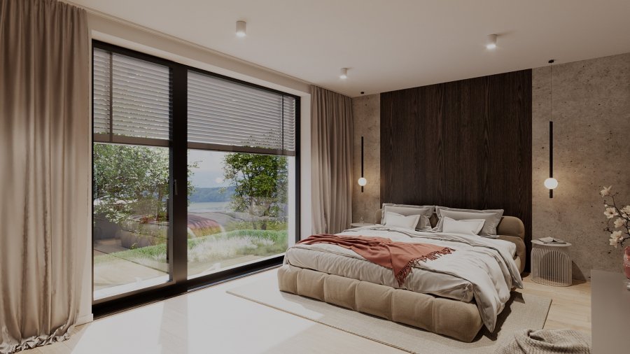 Návrh jednotlivých vil v nadčasovém a elegantním designu od architekta Pavla Fanty klade důraz na maximalizaci prostoru a komfortu pro celou vaši rodinu. Soubor čtyř nemovitostí je nápaditě usazen do členitého terénu, čímž nabízí výhledy do krajiny i soukromí. Útulné dvoupodlažní domy v přízemí disponují kuchyní, prostorným obývacím pokojem s terasou, koupelnou a toaletou, technickou místností, pokojem pro hosty a v případě větší vily také samostatnou pracovnou. V horním patře se rozkládají tři ložnice, ta hlavní s vlastní koupelnou a šatnou a druhé dvě se vstupem na balkon, pracovna, koupelna a komora pro pračku a sušičku (v případě menších domu bude tato umístěna v přízemí). Vybavení vil je navrženo tak, aby co nejlépe splňovalo potřeby luxusního bydlení. Chybět určitě nebude podlahové topení, příprava na klimatizaci ani dřevěná okna s trojsklem a s přípravou pro předokenní žaluzie. Samozřejmostí jsou vysoké standardy jako například dřevěné podlahy. V koupelnách se pak jedná o keramickou desku Vitra Shift, baterie Hansgrohe, volně stojící vanu či sprchové kouty typu Walk-In.